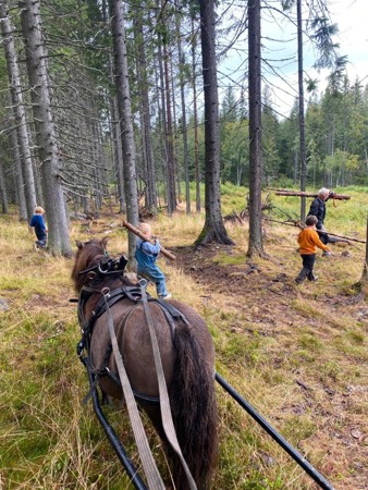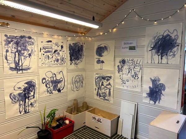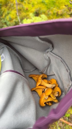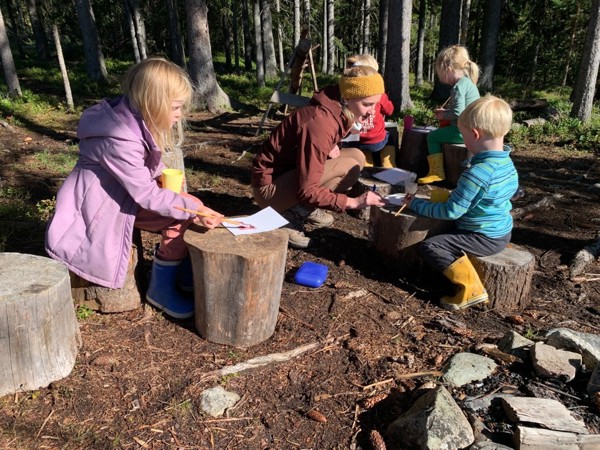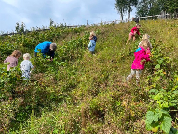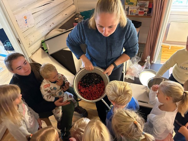 Vi høster inn grønnsaker fra kjøkkenhagen, som gulrøtter, sukkererter, bær, poteter og ulike kålplanter. Vi høster også inn bær og sopp fra naturen, som vi finner når vi er ute på tur. Av produktene vi høster inn, lager vi varmlunsj i barnehagen, spiser til fruktmåltidet, safter eller sylter. Vi putter mye rett i munnen også, og det er så godt!! :-) Vi har også blåbær ekstra i fokus denne perioden, og vi har laget saft og kunstverk med blåbæra, farget garn med blåbærlyng og lekt og dramatisert månedens sang "Blåbærturen" av Alf Prøysen. Det er mye å holde på med nå når det er høst, og vi jobber også med å skaffe ved til de ulike turplassene våre. Det trengs når vi er ute på tur hele vinteren! :-)