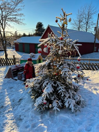 Vi startet adventstiden med å hente juletre fra egen skog. Dette har vi satt opp og pyntet utenfor barnehagen. Skikkelig julestemning når man kommer inn porten - spesielt etter at snøen kom!