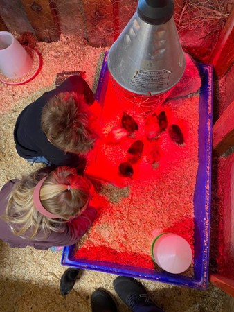 Hver dag ser vi naturen byr på nye opplevelser med fugler, blomster, insekter, og alt annet som våkner til liv når kulda slipper taket! I fjøset gleder vi oss også stadig over nye ting - vi har fått kyllinger i vår, som etter hvert skal få komme ut til de store hønene, og vi følger med på lammingen som skjer i fjøset.