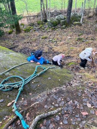 Klatreberget lever opp til navnet sitt med mange fysiske utfordringer for store og små. Det er klatring opp berget i tau eller klatring i trær som både står og ligger. Ofte tar vi også med både kniver og sag, og ungene får lov til å lære seg å handtere slike redskaper i samvær med ansatte.