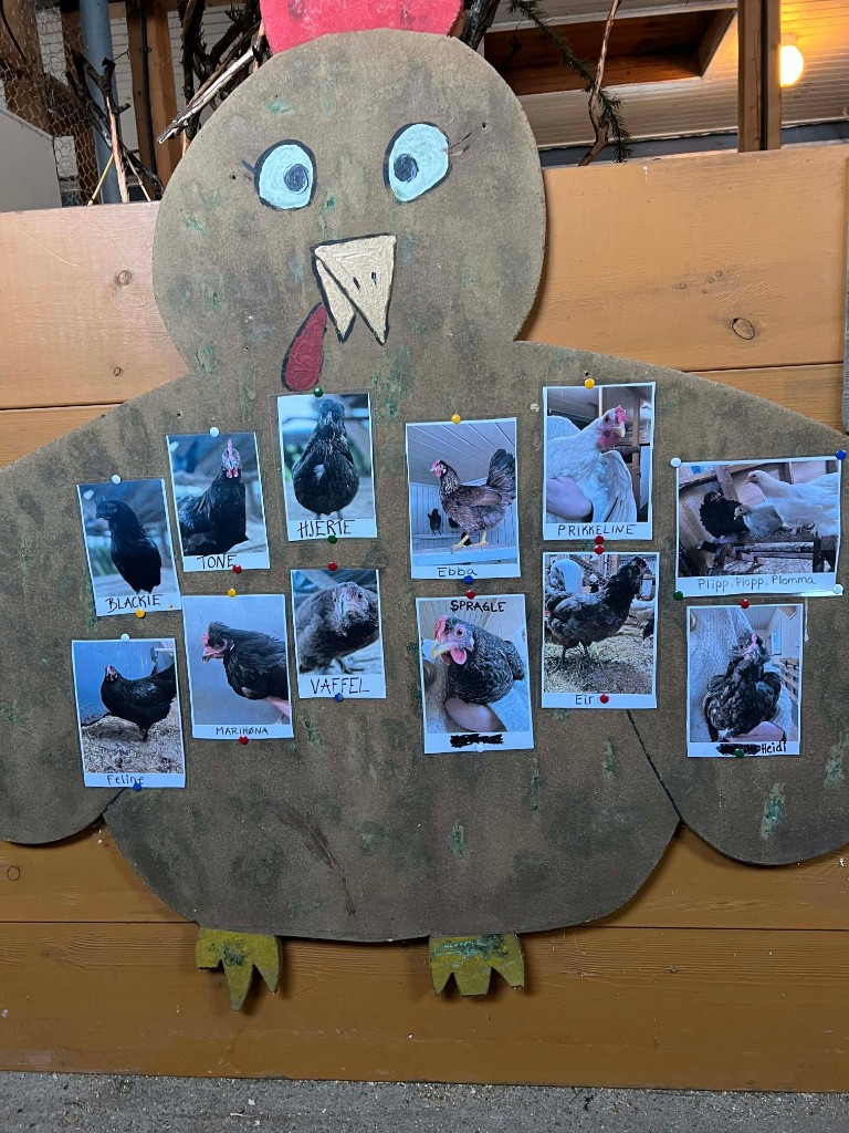 Vi har 14 høner i barnehagen nå. Rasene er ulike og hønene verper forskjellig fra dag til dag. Det er stas for ungene å finne egg som de kan ta med seg hjem. Om sommeren går hønene i utebur i barnehagen, slik at ungene er med å forer, koser og steller med dem. Om vinteren står de inne i fjøset vårt, og ungene er med å steller dem der.