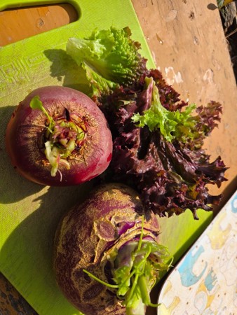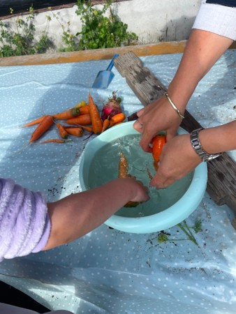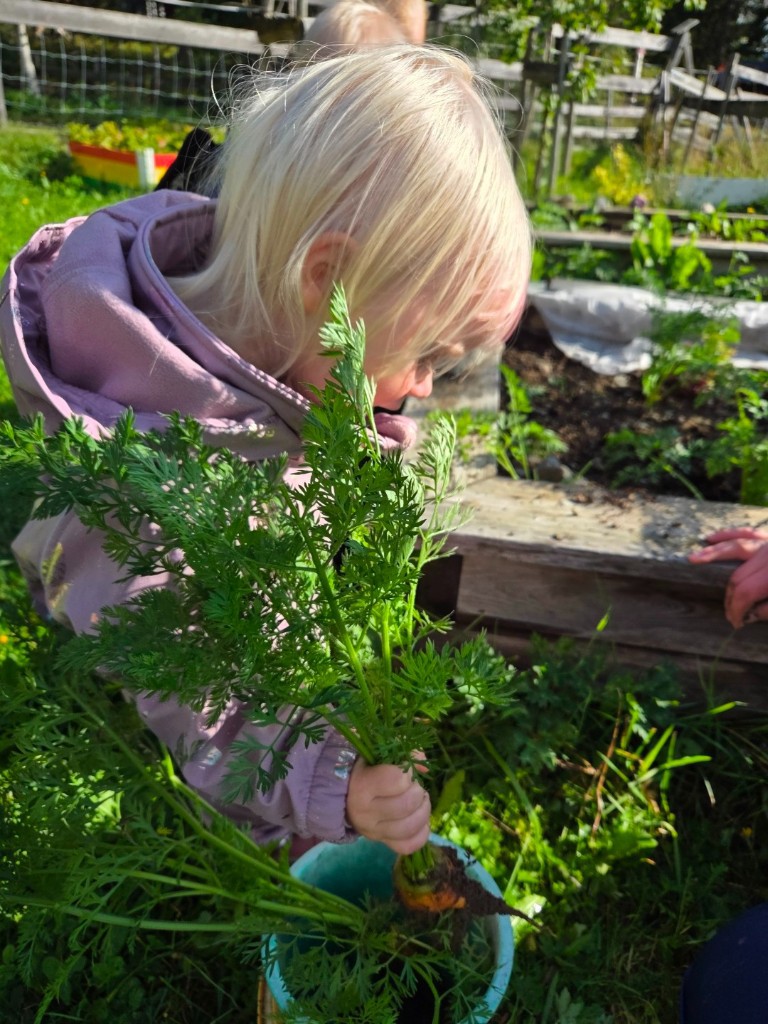 I grønnsakshagen vår nå har vi blant annet sukkererter, rødbeter, purre, jordbær, gulerøtter, ulike salater, ringblomster,poteter, rips og solbær. Vi varierer hvert år hva vi har i kjøkkenhagen, slik at det blir noe nytt hver gang. Barna tar del i hele prosessen fra såing til høsting og hvordan vi kan bruke råvarene i etterkant. Det er gøy å være med å kutte opp, og lage de deiligste retter!