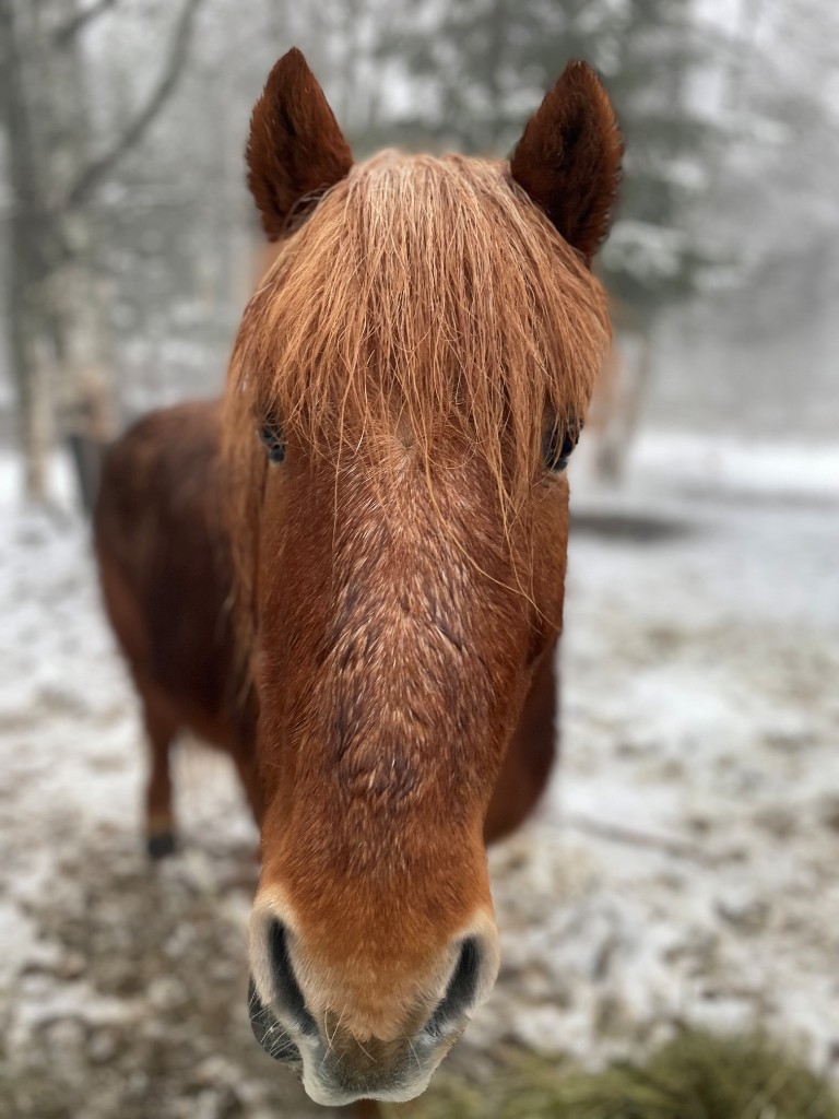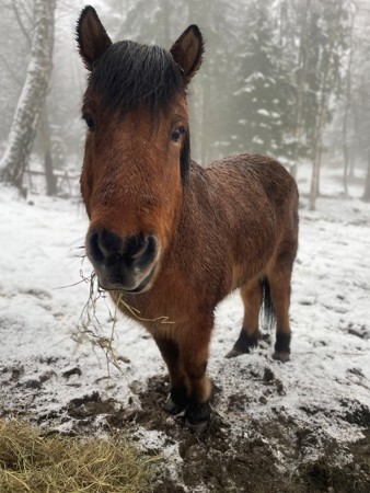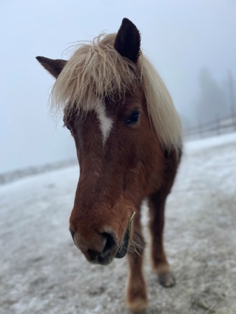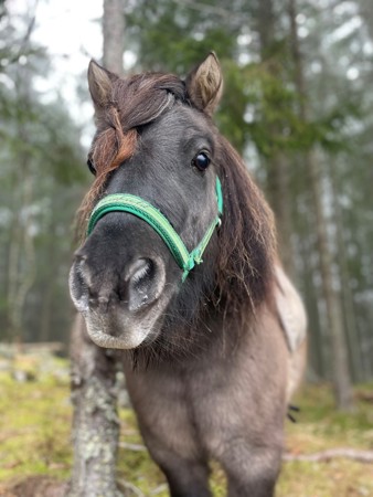 Odin er vår sjarmerende shetlandsponni og det er han vi bruker mest i hverdagen. Vi er på rideturer, kjøreturer med vogn og med slede på vinteren.